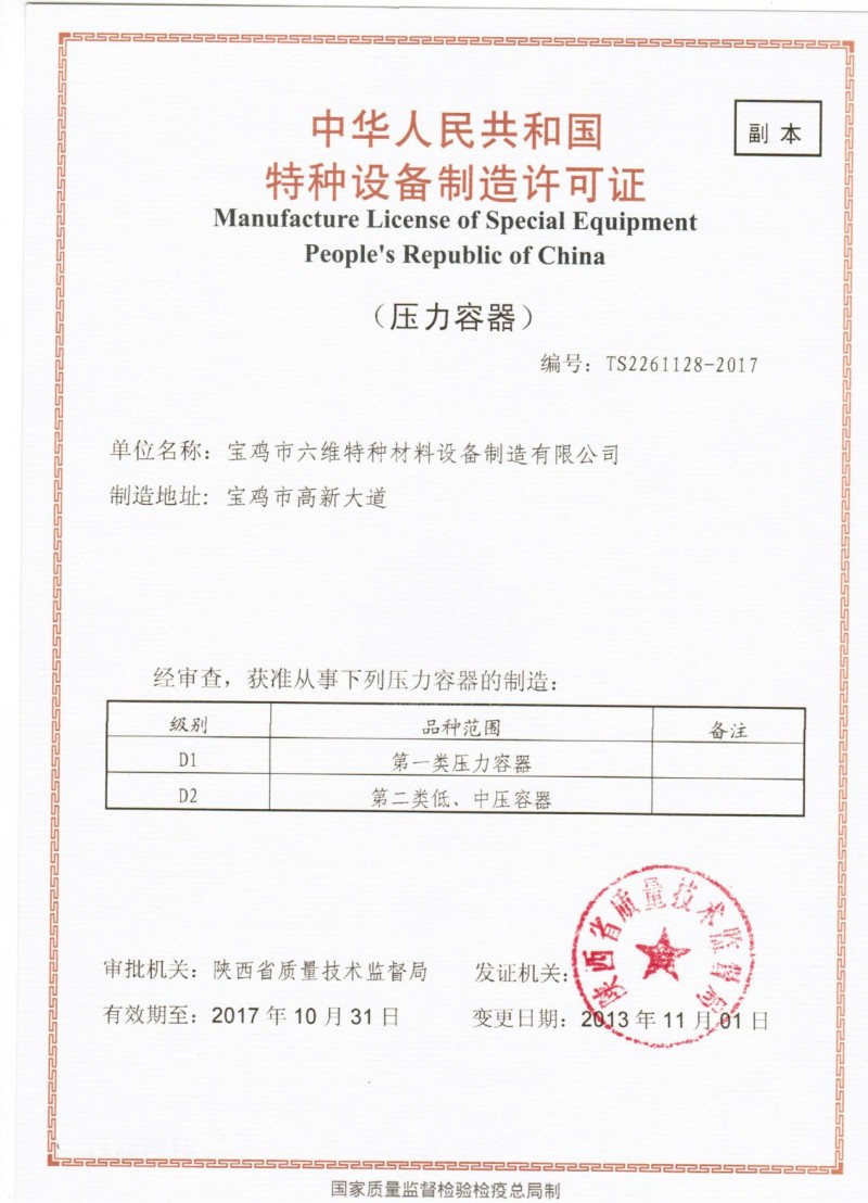 » 寶雞市六維特種材料設備制造有限公司 »資質證書